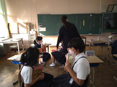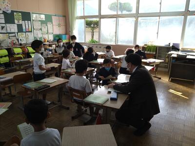 今日は、天草市教育委員会の先生、御所浦中学校の先生、東京からの学生さん(キャラバン隊)が来校されました。2時間目の5年生の国語の授業では、タブレット端末に自分の考えを残しながら、話し合いが行われました。児童は、緊張しながらも話し合いが少しずつ活発になっていく姿が見られました。緊張の中での授業、これも大切な経験です。