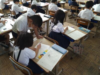 今日は畑の先生方へお礼の手紙を書いていましたが、2年生の早くお礼の手紙を書き終わって子どもたちがスモール先生として、一年生の子どもたちに書き方などを教えてくれていました。やさしい教え方とてもすてきでした。