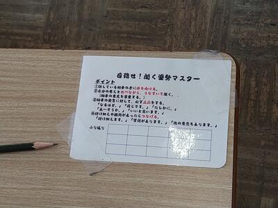 5年生は、児童それぞれの机の右上に「目指せ!聴く姿勢マスター」というものをはり、いつでも意識化できるように工夫していました。「自分たちで」がとても大切ですね。