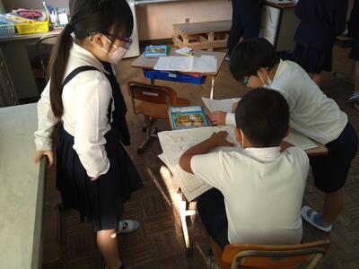 2年生の学習の様子です。自分で書いたおもちゃの作り方説明書を友だちに見てもらい、「ここわかりにくいから、・・・って書いた方がよくない」などアドバイスをしあっていました。