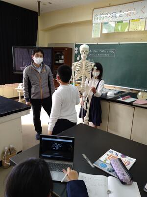 4年生は理科の学習でした。体のつくりの学習です。動物の骨の様子と人間の骨の様子の似ているところと違うところを話し合います。