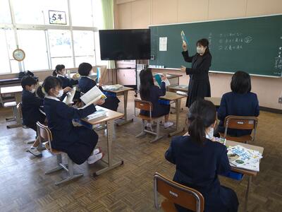 今日は、天草市教育委員会の先生、御所浦中学校の先生、東京からの学生さん(キャラバン隊)が来校されました。2時間目の5年生の国語の授業では、タブレット端末に自分の考えを残しながら、話し合いが行われました。児童は、緊張しながらも話し合いが少しずつ活発になっていく姿が見られました。緊張の中での授業、これも大切な経験です。