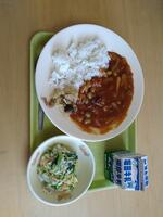スタートはハヤシライス、ポパイサラダです。美味しい給食今年も楽しみにしています