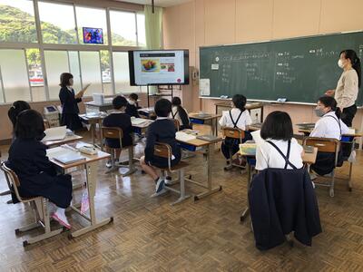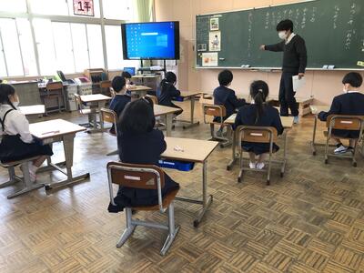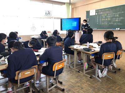 今日は、天草市教育委員会の先生、御所浦中学校の先生、東京からの学生さん(キャラバン隊)が来校されました。2時間目の5年生の国語の授業では、タブレット端末に自分の考えを残しながら、話し合いが行われました。児童は、緊張しながらも話し合いが少しずつ活発になっていく姿が見られました。緊張の中での授業、これも大切な経験です。