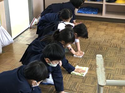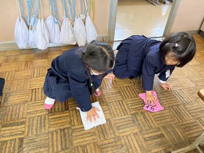 掃除の仕方の学習。ぞうきんを4つ折りにして、一列に並んで拭きます。一で横に拭き、二でぞうきんの幅分だけ上げて、三で横に拭く・・・。両膝をついて、しっかりとぞうきんを押さえて丁寧に拭いていました。とっても上手です。