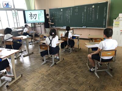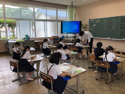 今日は、天草市教育委員会の先生、御所浦中学校の先生、東京からの学生さん(キャラバン隊)が来校されました。2時間目の5年生の国語の授業では、タブレット端末に自分の考えを残しながら、話し合いが行われました。児童は、緊張しながらも話し合いが少しずつ活発になっていく姿が見られました。緊張の中での授業、これも大切な経験です。