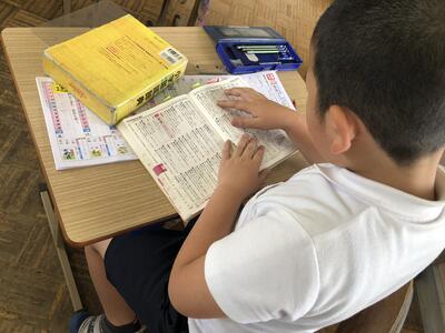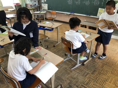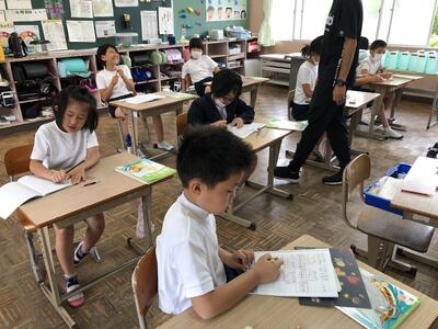 1年生。国語で自分が好きなこととその理由を一生懸命書いていました。自分の好きなことを書くときって、自然と笑顔になるんですね。