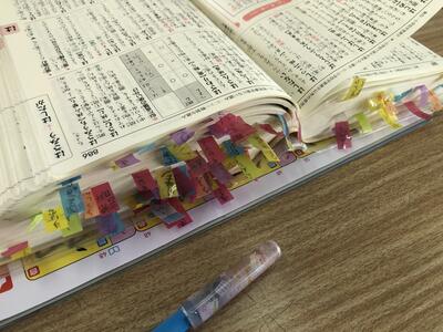 見てください!この国語辞典に貼られた付箋の数!これまでに調べた多くの言葉が書かれた付箋が貼られていました。すごいですね!達成感もあります。