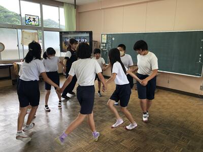5年生。フォークダンス(「マイム・マイム」)の動きの確認中。思わず私も子供たちの輪に入って踊り出しました。笑顔が絶えません!
