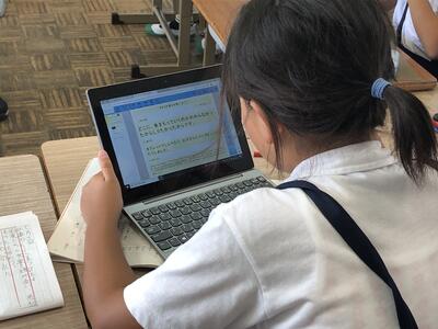 自分の家族の仕事について、インタビューしたことを元にタブレットを使ってまとめています。調べた理由、調べ方、分かったこと、まとめと効果的に写真を取り込んでまとめています。家族の仕事について調べ、その仕事を知り、その仕事の魅力に気づき、家族への誇りを持った子供たちの表情は生き生きとしていました。