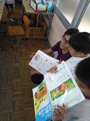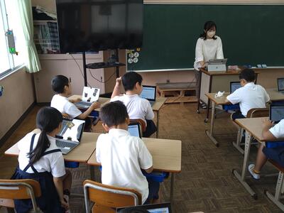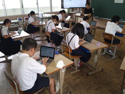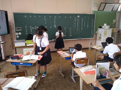 今日は、天草市教育委員会の先生、御所浦中学校の先生、東京からの学生さん(キャラバン隊)が来校されました。2時間目の5年生の国語の授業では、タブレット端末に自分の考えを残しながら、話し合いが行われました。児童は、緊張しながらも話し合いが少しずつ活発になっていく姿が見られました。緊張の中での授業、これも大切な経験です。