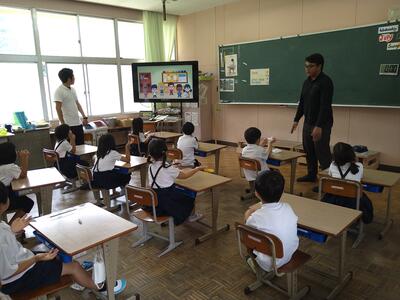 本日、新しいALTのセオドア先生が着任され、歓迎会を実施しました。7月末にアメリカから日本に来られたばかりで、今、日本語の勉強中なのだそうです。しかし、自己紹介では、流暢な日本語でスピーチされました。早速、1時間目から6年生の授業に入っていただきました。出身地やご家族のことについて話され、子どもたちも笑顔で授業を受けていました。