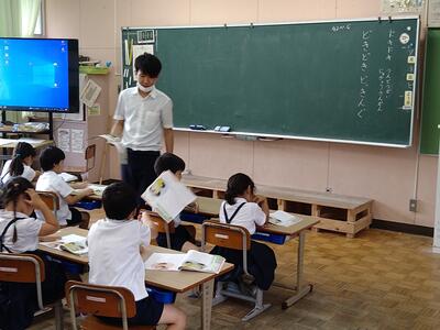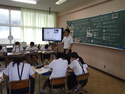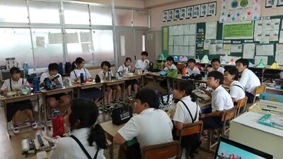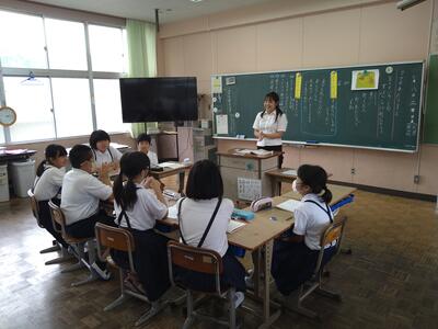 今日は、天草市教育委員会の先生、御所浦中学校の先生、東京からの学生さん(キャラバン隊)が来校されました。2時間目の5年生の国語の授業では、タブレット端末に自分の考えを残しながら、話し合いが行われました。児童は、緊張しながらも話し合いが少しずつ活発になっていく姿が見られました。緊張の中での授業、これも大切な経験です。