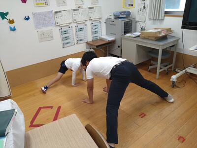 今日の授業のようすです。のびのび学級は朝の運動タイム。「かえる」ジャンケン中。楽しみながら体を動かし、いろんな巧みな体の動きに慣れていきます。