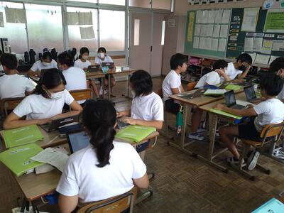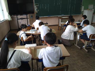 今日は、天草市教育委員会の先生、御所浦中学校の先生、東京からの学生さん(キャラバン隊)が来校されました。2時間目の5年生の国語の授業では、タブレット端末に自分の考えを残しながら、話し合いが行われました。児童は、緊張しながらも話し合いが少しずつ活発になっていく姿が見られました。緊張の中での授業、これも大切な経験です。