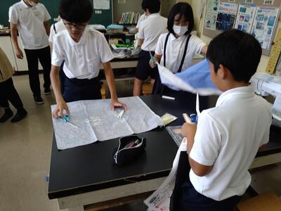 先生方も助っ人として協力します。一昔みたいに型紙を使って、チャコペンで描くところからではなく、もう布に裁ち線、折り線、縫い線などあらかじめかいてあります。