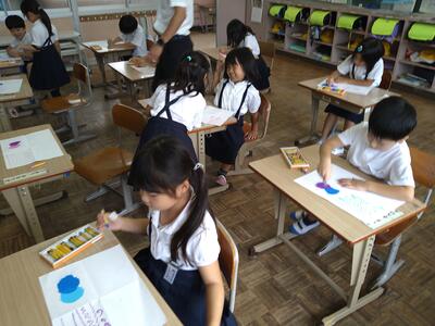 1年生はクレヨンのいろんな使い方、混色の仕方、色のぼかし方など練習中です。
