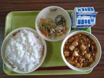 今日の給食です。茄子入り麻婆豆腐、ひじきシューマイ、そしてナムル。絶妙な組み合わせ。今日もご飯が進みました。ありがとうございます。ごちそうさまでした!!