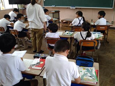 1年生は、国語。「くじらぐも」の導入です。くじらぐもの著者は「なかがわりえこ」さんです。