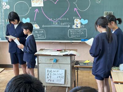 人権集会を行いました。人権主任の先生方からは、「自分のよいところに目を向けてみよう」というお話がありました。その後、縦割り班に分かれ、子どもたちは、友達のよいところをハート型の台紙に書き込んでいたものを手に紹介しました。誰のことが書かれているのか分からない班の友達は、発表を聞きながらドキドキしています。名前が明らかになると、紹介された子は嬉しそうに言葉を交わし、温かな雰囲気が広がりました。子どもたちが体育館を後にしたあとも、会場にはいつもより柔らかく、温かい空気が残っていました。