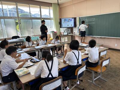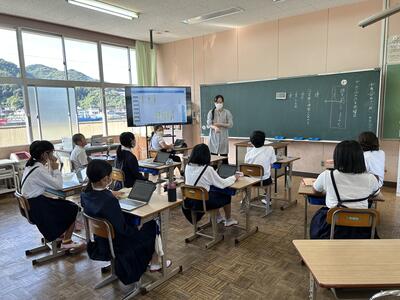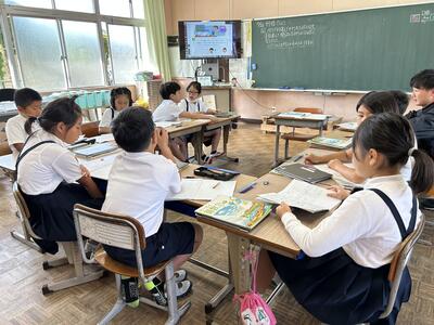 今日は、天草市教育委員会の先生、御所浦中学校の先生、東京からの学生さん(キャラバン隊)が来校されました。2時間目の5年生の国語の授業では、タブレット端末に自分の考えを残しながら、話し合いが行われました。児童は、緊張しながらも話し合いが少しずつ活発になっていく姿が見られました。緊張の中での授業、これも大切な経験です。