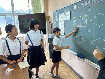 全体から周りの三角形を引いたり、ひし形を分割したりしながらいろいろな友達の考えに自分の考えを深めていきます。友だちの考えに対して疑問に思ったことがすぐに言えることがステキです。