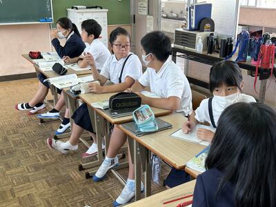 4年生。詩を工夫してかこうの学習。教師自作のバッタの様子を表すいくつもの言葉を自分の思いに合わせて入れ替えながら学習を進めていきます。「ああ」という言葉も、初めに言う「ああ」と最後に入れる「ああ」では、意味が変わってきて面白いね。と新たな発見もありました。次の時間は、自分の詩の並べ替えを行います。