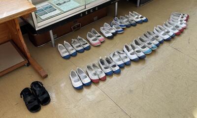 こちらをご覧ください。ホール前に整然と並べられた子供たちの上靴。教師が言わずともいつもできている当たり前。素晴らしい!