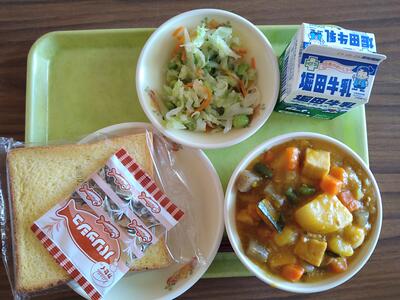 さて、今日の給食です。カボチャのそぼろに・・・あっ!ハローウィーンが近いからかな?
