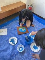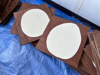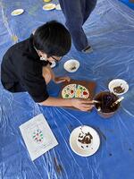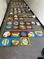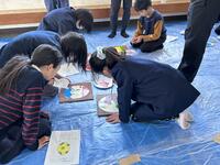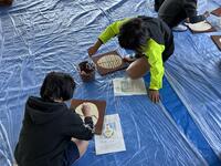 事前に「御所浦せんばいなか」の方々がコンパネを30cm×30cmの板材を切り出し、卵の形を塗ったものに事前に考えておいた、オリジナルのデザインの色つけを行っていきました。