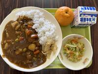 今日の給食「ミートボールカレー、するめ和え、福神漬け、デコポン(御所浦産)」