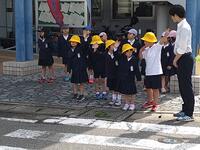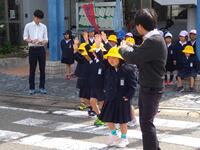 学校横の信号付きの横断歩道で手をあげて左右を確認して、止まってくれたドライバーの方にお礼まで。1年生もしっかりできました。