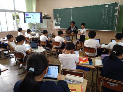 今日は、天草市教育委員会の先生、御所浦中学校の先生、東京からの学生さん(キャラバン隊)が来校されました。2時間目の5年生の国語の授業では、タブレット端末に自分の考えを残しながら、話し合いが行われました。児童は、緊張しながらも話し合いが少しずつ活発になっていく姿が見られました。緊張の中での授業、これも大切な経験です。