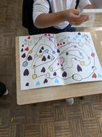 さて、授業の様子です。1年生はすごろくづくりです。サメがいたり、ハートがあったり、船が浮かんでいたり、それぞれの思いが詰まったすごろくです。