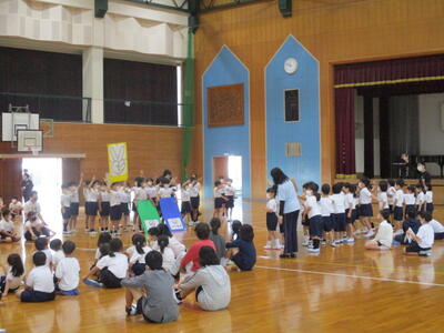 全校児童の前で、各委員会の今年度の活動の報告等がありました。