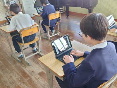 この決勝大会は、先日行った全児童が参加した予選大会の各学級成績上位3人、計12人によるものでした。音楽室で行われた決勝大会の様子は、学習管理システムGoogleClassroomwを活用し全学級に配信され、全児童が見守る中で行われました。