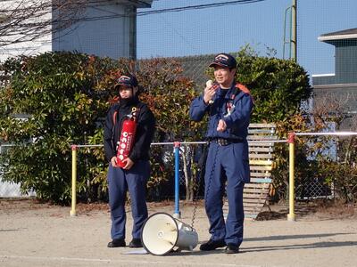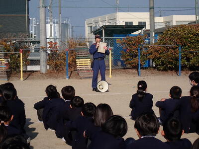 その中、子供たちの避難行動は大変速く、火災発生を知らせる放送から全児童が運動場に避難完了するまでの所要時間は、3分かかりませんでした。これには、消防署員の方からもお褒めの言葉をいただきました。しかし、ポケットに手を入れたり、しゃべったりしながら避難している子供がいたことに対しては、消防署員の方から、してはいけない理由と共に自分の命を守るために絶対にしないようにと指導していただきました。学校でも引き続き、命を守る行動「お・は・し・も」(押さない・走らない・喋らない・戻らない)を繰り返し伝え、浸透させたいと思います。