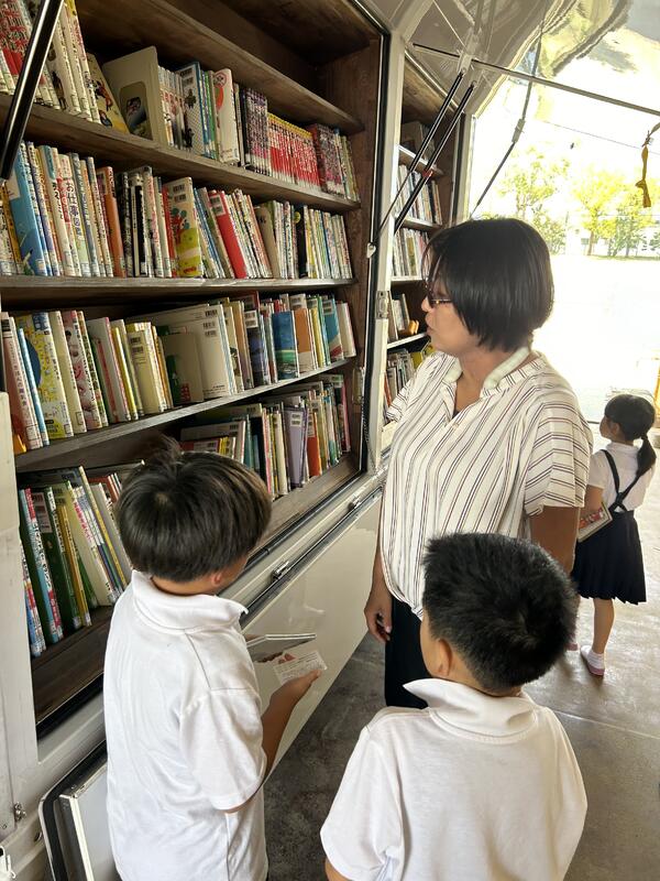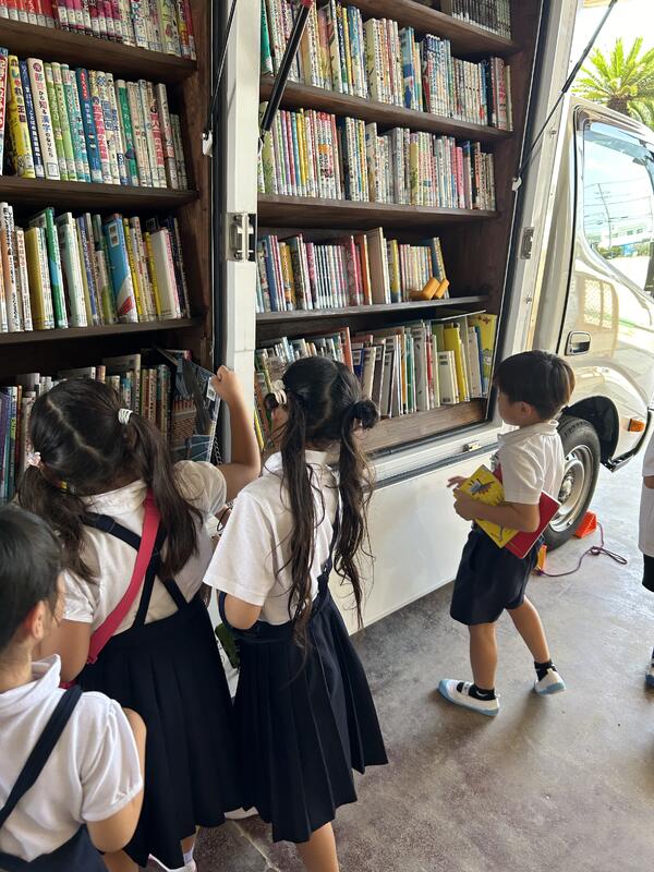 トラックの中にたくさんの本がのっているのを見て、大興奮の1年生でした。