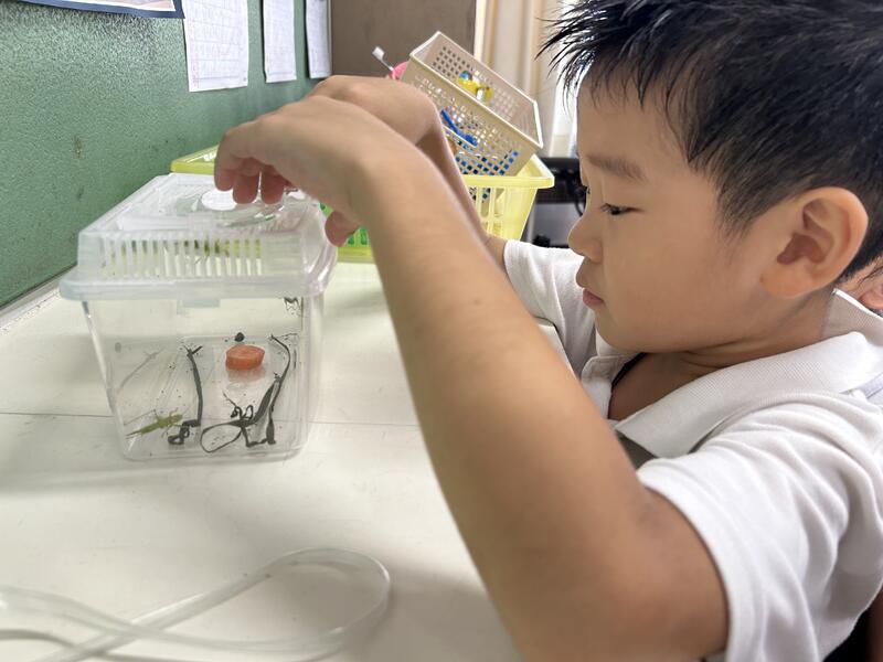 その後、タブレットで虫の様子を動画で撮ったり、虫メガネで拡大して虫の細かなところを観察したりして、虫の不思議について調べました。