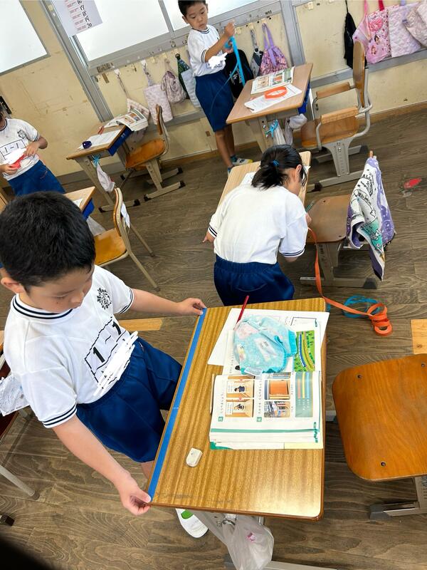 この時間では、机がドアから出すことができるか、というめあてがあり、紙テープを使って長さをはかることで、長さを比べていました。