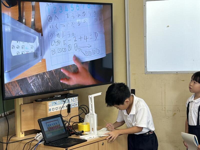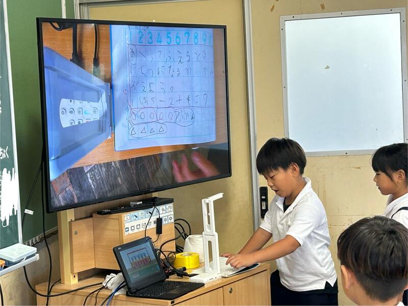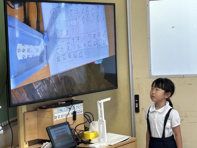 また、その自分の考えを実物投影機を使って皆に見せて、自分で説明することもできるようになってきました。説明の仕方も、とても分かりやすく、皆が発表することで、今日の学習のポイントをしっかりと押さえることができました。