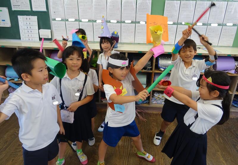 図工の時間に、わっかを用いて変身する活動を行いました。限られた時間の中で、子どもたちが考え、あらわすことができていました。