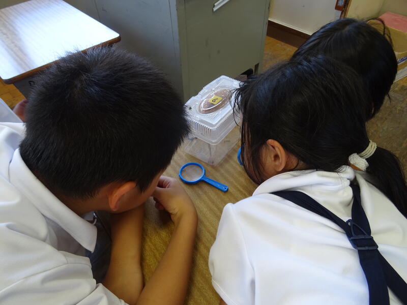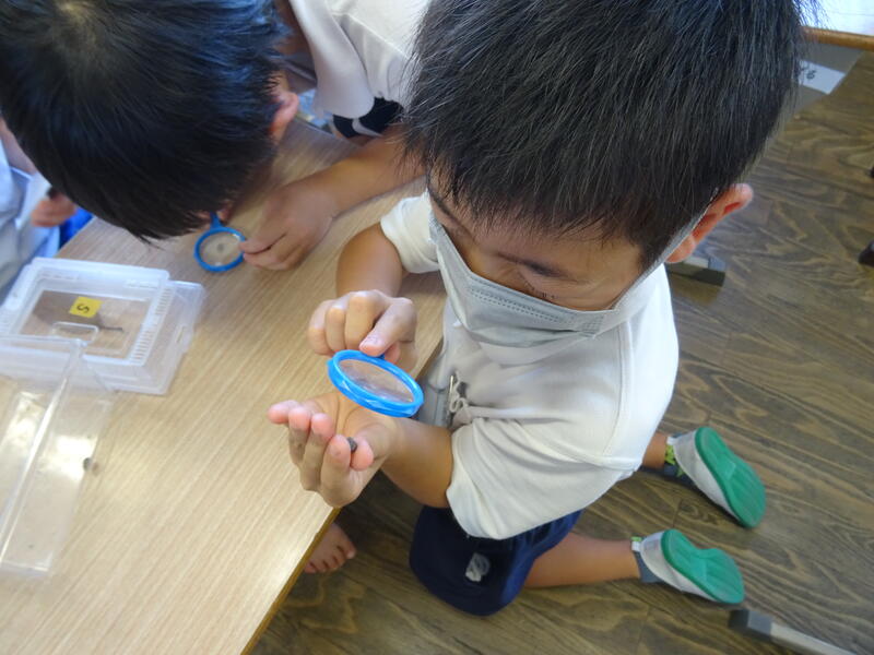 虫取り網を使って、班の友達と協力しながら虫取りをしていました。虫取りをした後は、教室で虫眼鏡を使って虫を観察しました。ダンゴムシをとっている班が多く、よーーく見ていました。