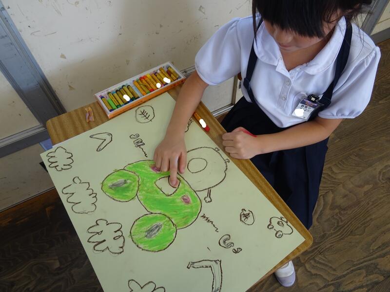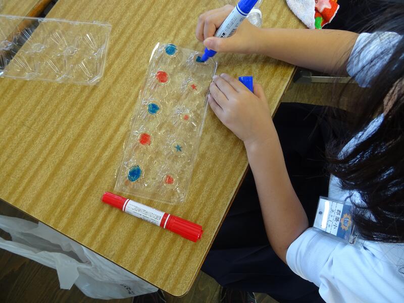 図画工作で、「光のプレゼント」の学習を行いました。透明なプラスチックの材料にペンで色をつけていきました。