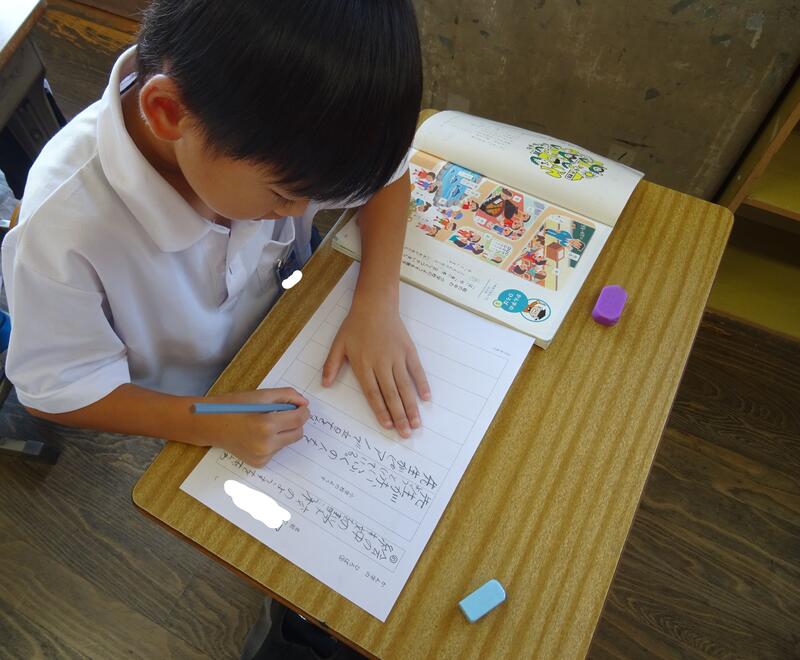 今日の国語の授業で、国語の上巻の学習を終えました。最後の授業では、「かん字のひろば」という、教科書に出てくる漢字を使って、文章を考える活動をしました。