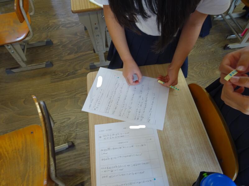 一人で考えた後は、お友達とかいたものを読み合いました。「おもしろい文」「なるほどと思った文」に、いいねシールを貼り、お互いの考えを認め合いました。