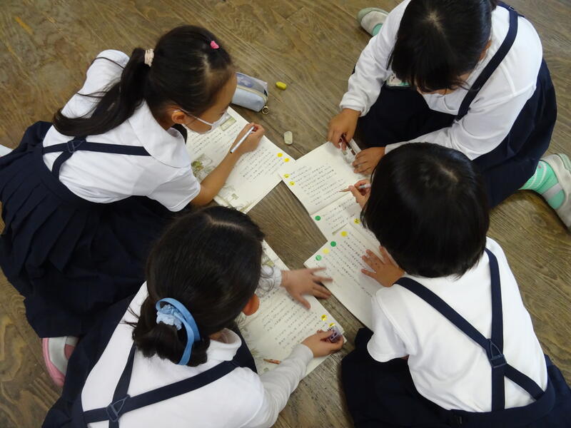 発表会の作戦会議中です。工夫して読むところを話し合っています。