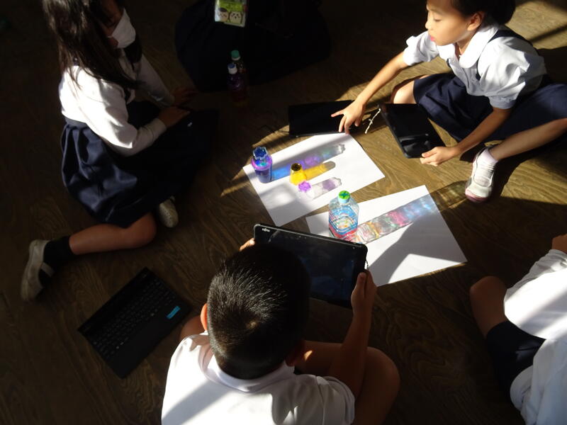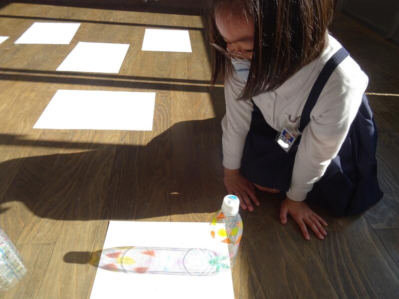色塗りがおわったら、太陽の光が当たる場所に行き、光を通して色や形の変化を確認していました。