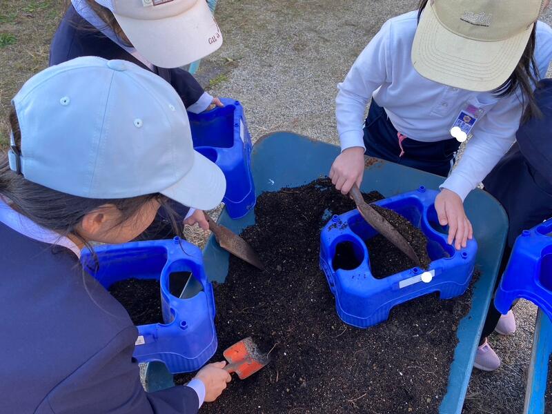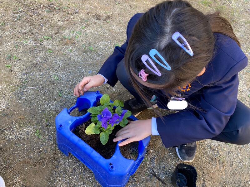 パンジーを植えました。自分で土を植木鉢に入れるところから行いました。量を調整しながら、自分たちで植えることができました。