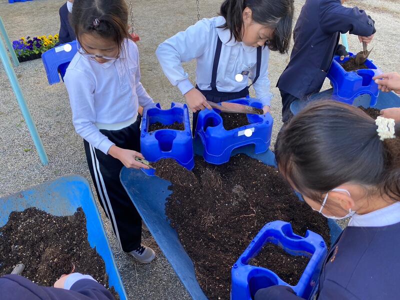 土を入れた後は、パンジーの苗を植木鉢に植えていきました。1学期に野菜を植えたときの体験をいかして植えることができていました。